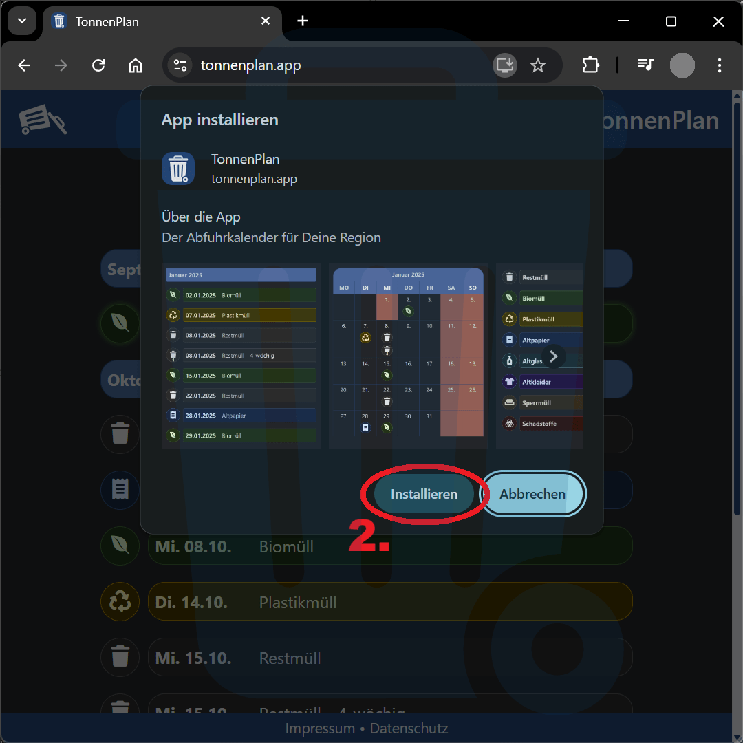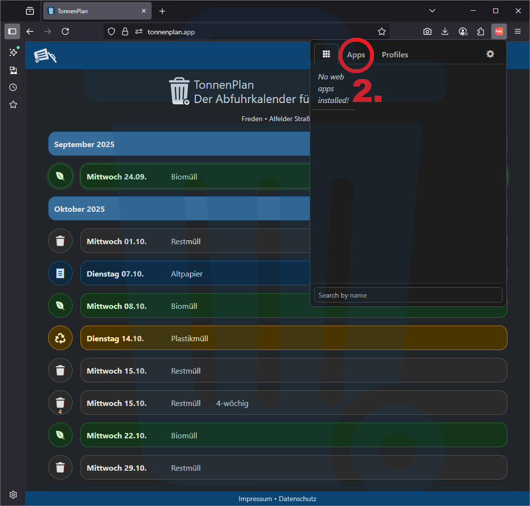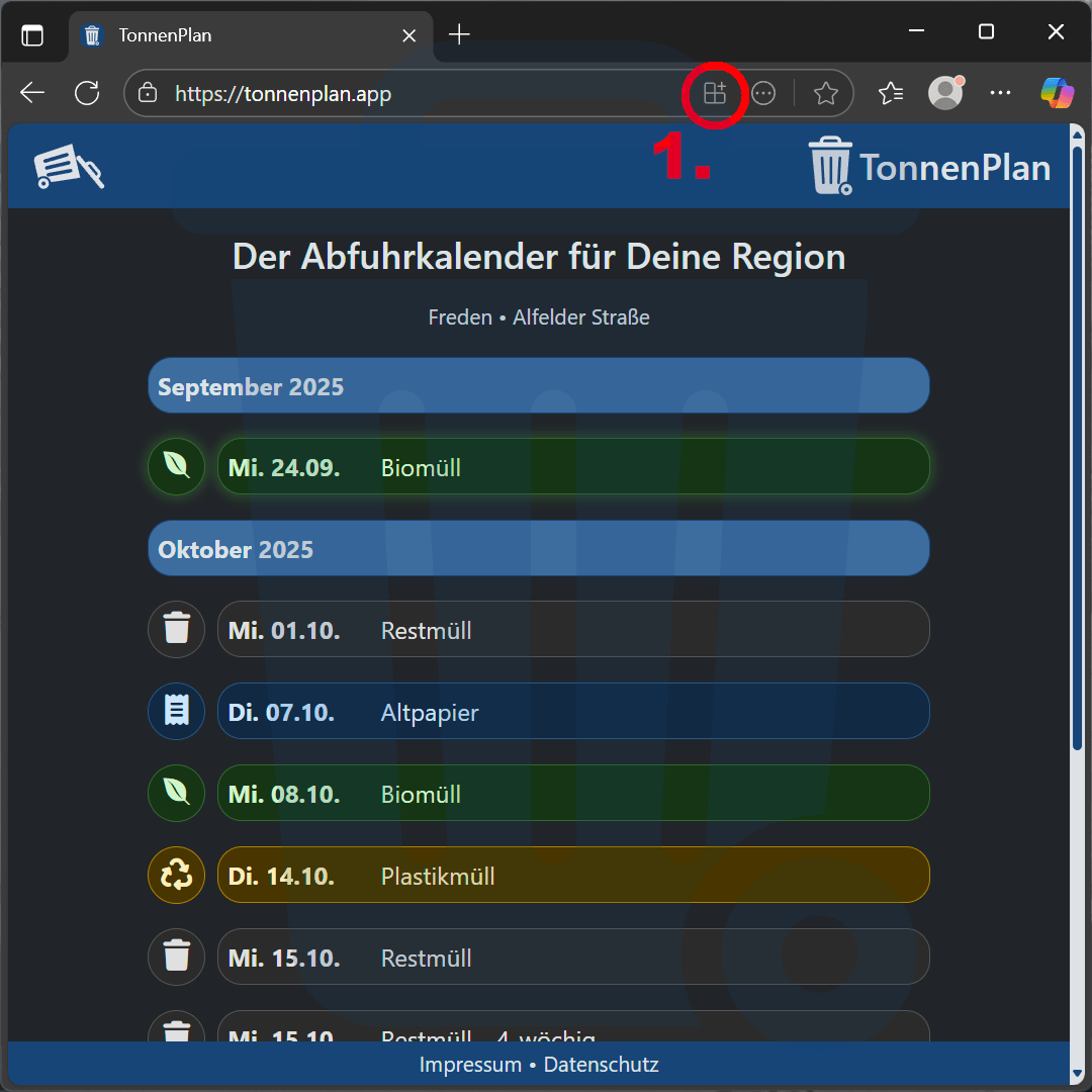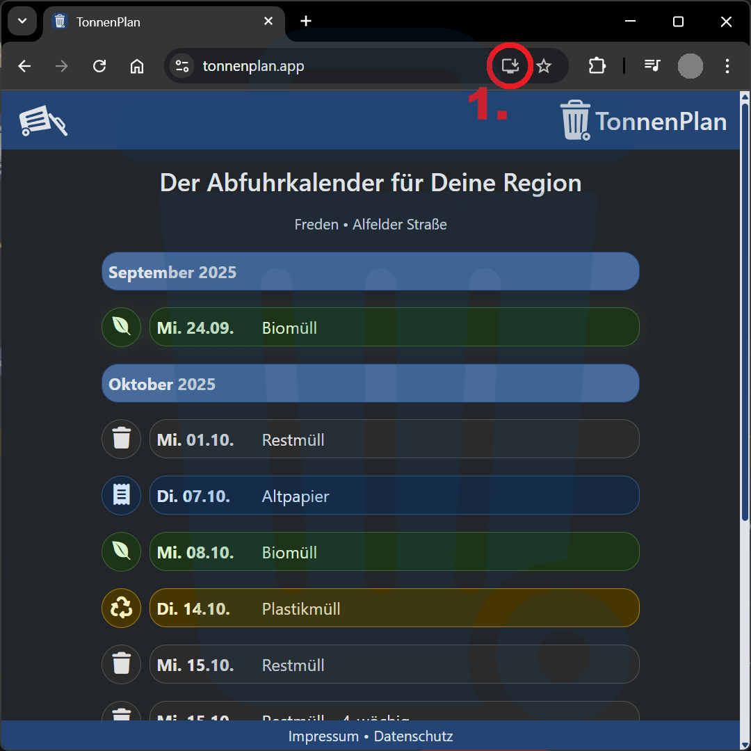 Hier erfährst Du, wie Du TonnenPlan als App auf Deinem Gerät nutzen kannst – je nachdem, welchen Internet-Browser Du verwendest. So hast Du Deine Abfuhrtermine immer direkt griffbereit, ohne die Webseite jedes Mal neu öffnen zu müssen.