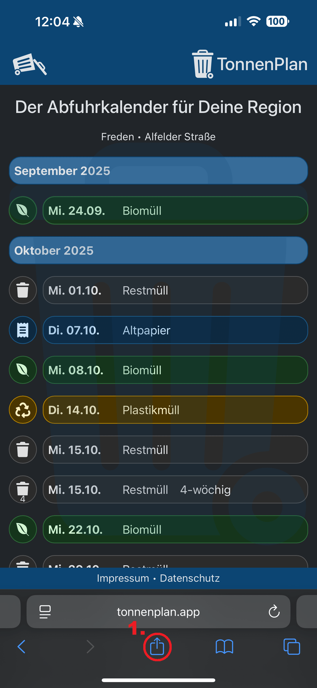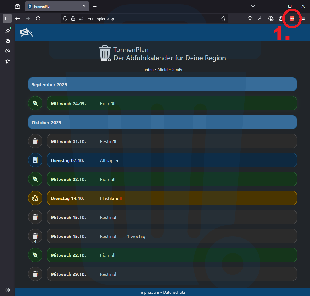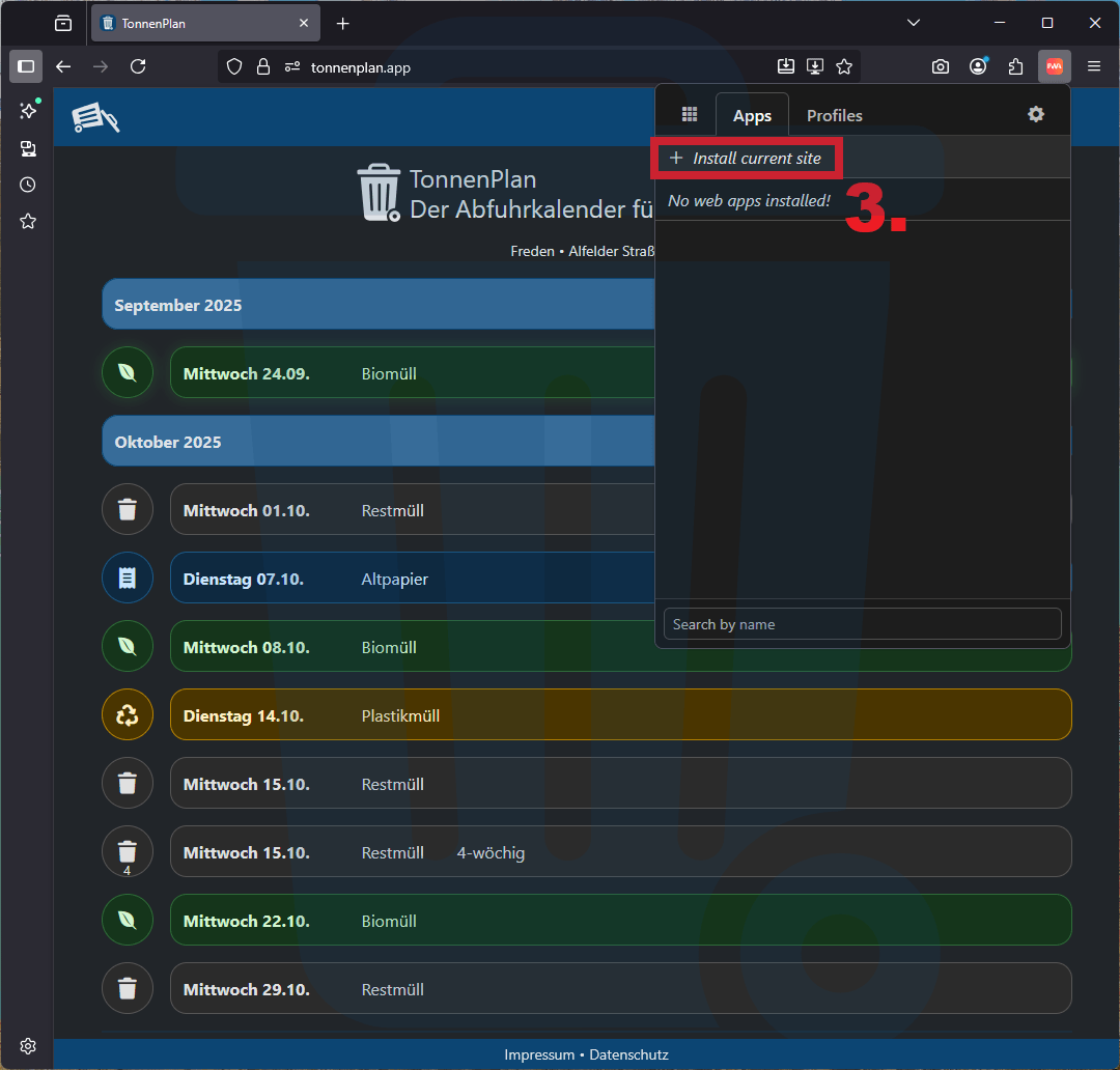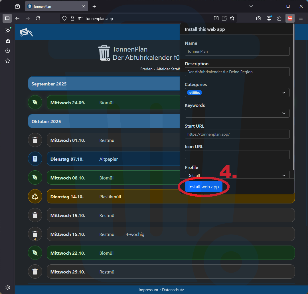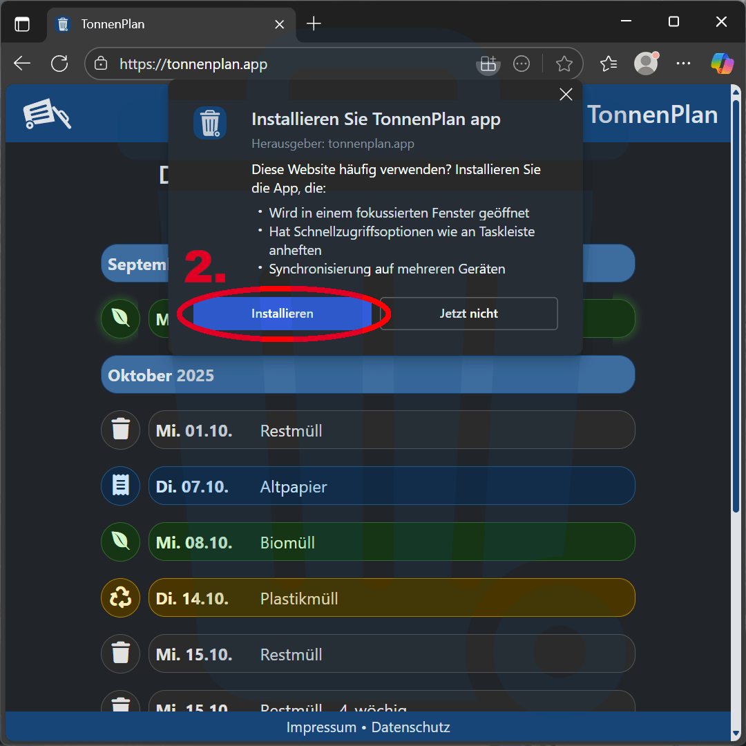 Hier erfährst Du, wie Du TonnenPlan als App auf Deinem Gerät nutzen kannst – je nachdem, welchen Internet-Browser Du verwendest. So hast Du Deine Abfuhrtermine immer direkt griffbereit, ohne die Webseite jedes Mal neu öffnen zu müssen.